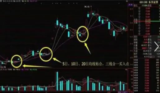(1)、三线向上交叉的时候,就预示着新一轮上涨行情启动,就可以在5日均线附近买入。
