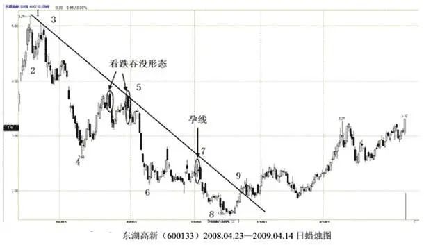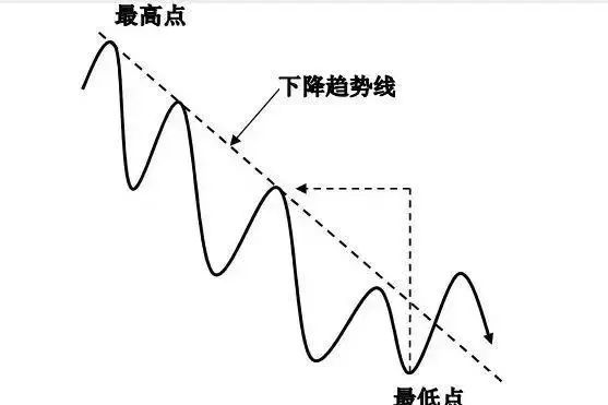 下降趋势线画法:连接某一时间段最高点(或相对高点)与最低点之前的任意高点,中间不穿越任何价位的直线,就是下降趋势线。