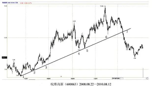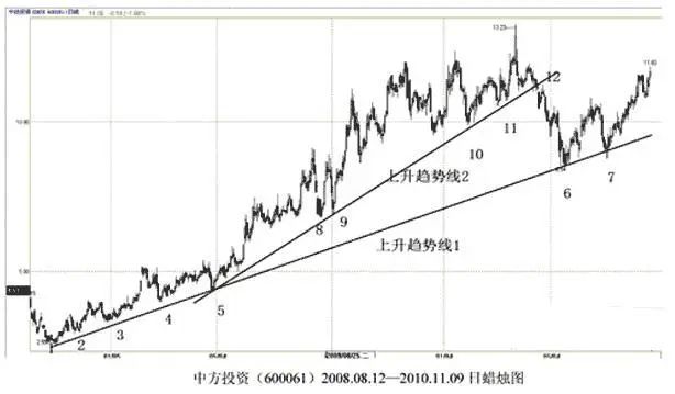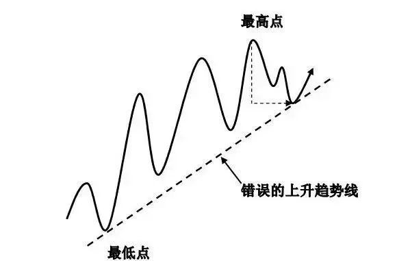 ● 首先要正确的画出趋势线,确定是由两个依次上升的低点做出的,要把上涨中的所有价格变化涵盖在内。