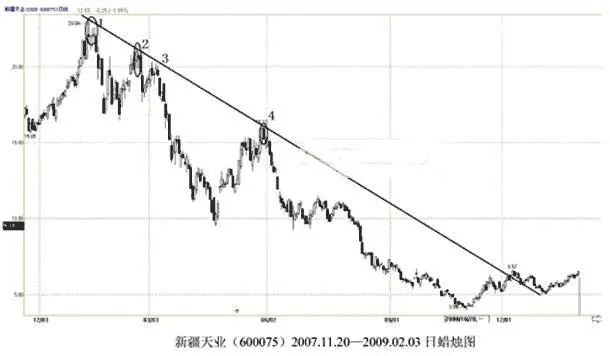 ●首先要正确做出趋势线,确定是由两个依次下跌的高点做出的,要把下跌中的所有价格变化都包括在内。